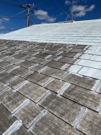 こちらの屋根は屋根材の隙間が微妙に広くローラーだけで塗装できれば楽なのですが、しっかりと塗れなかったり